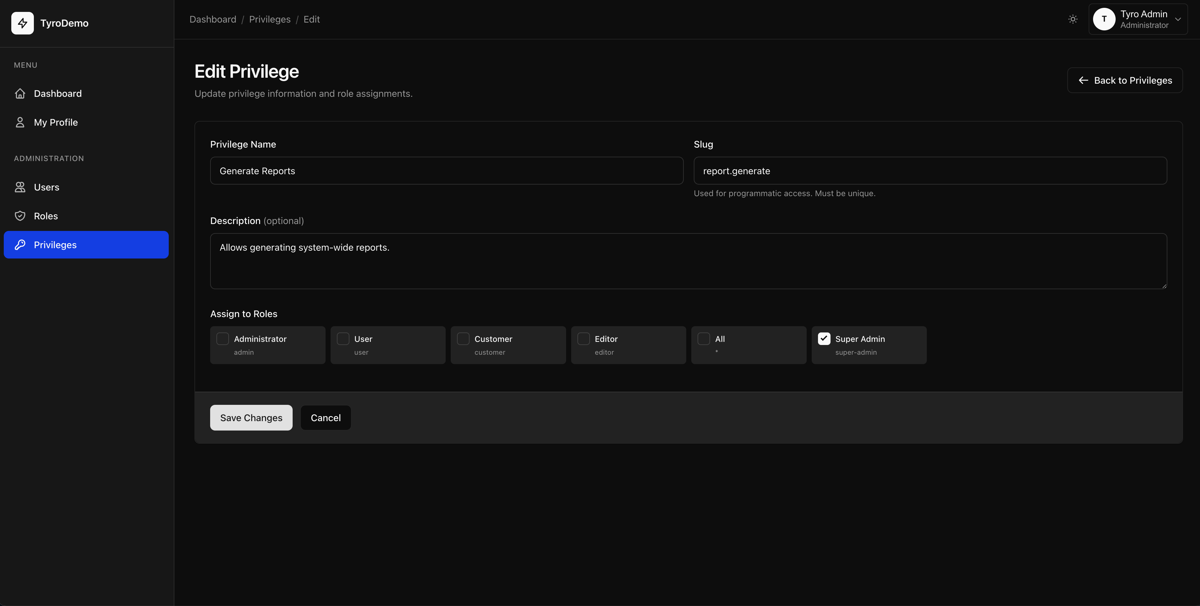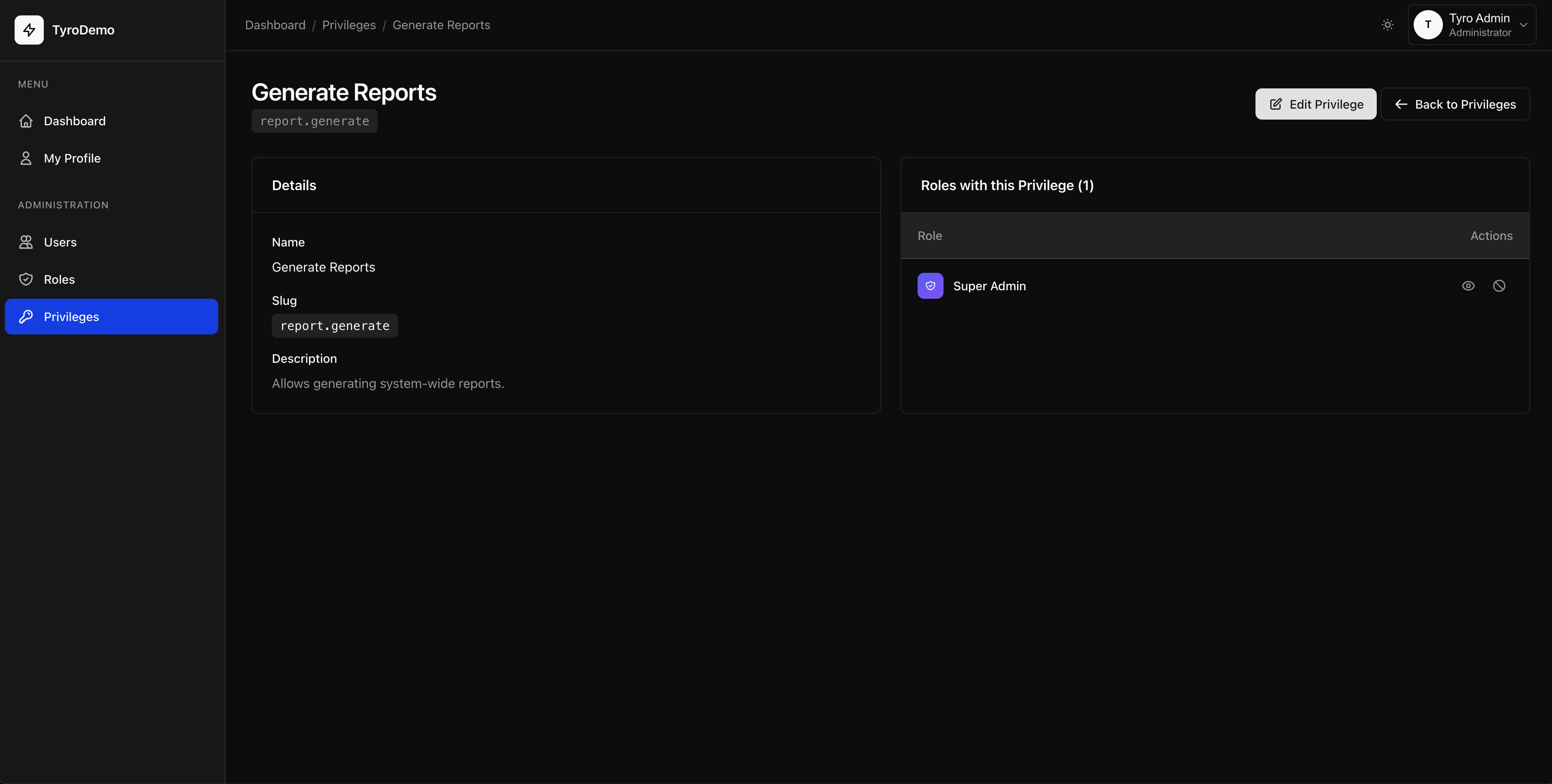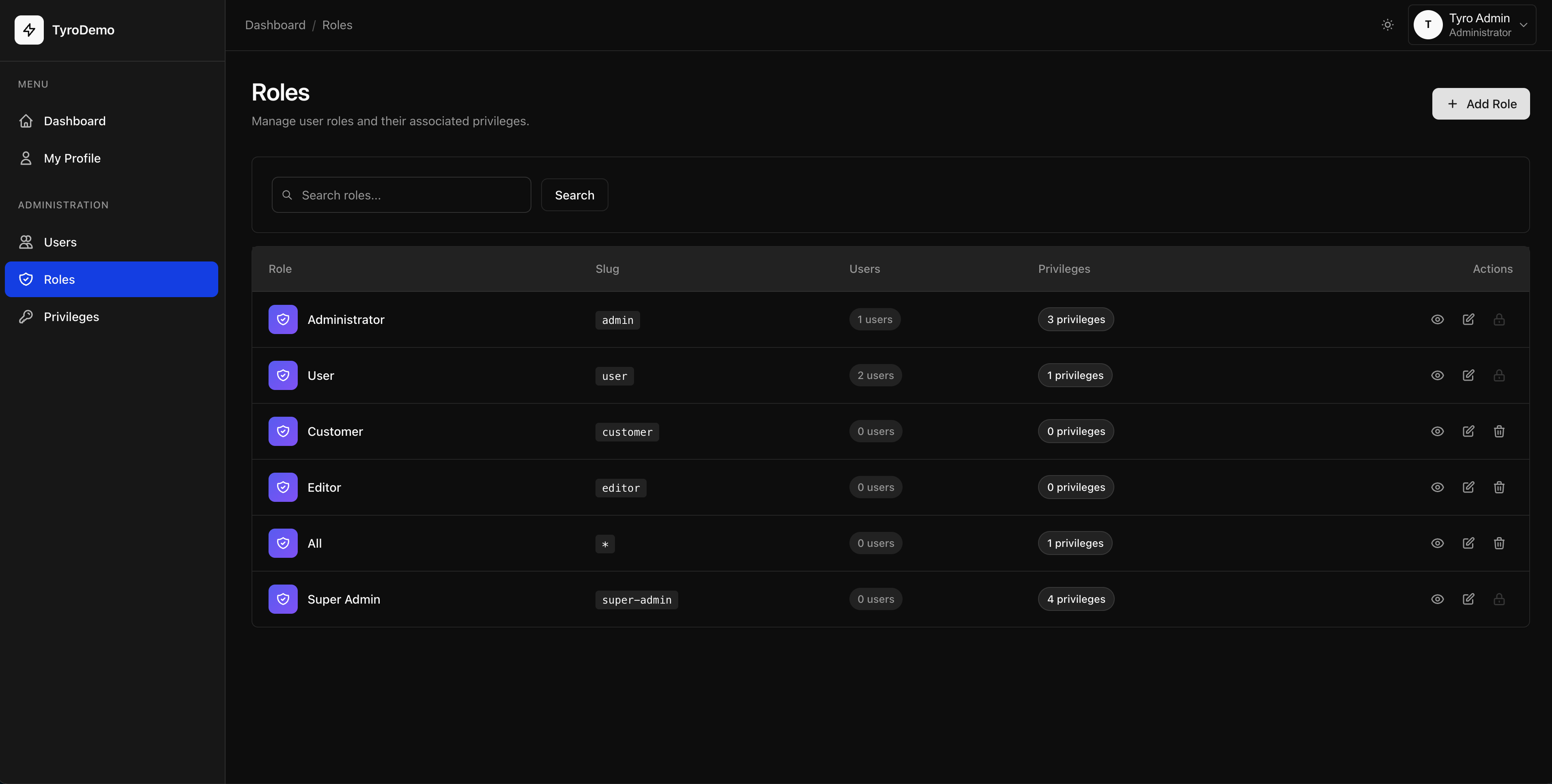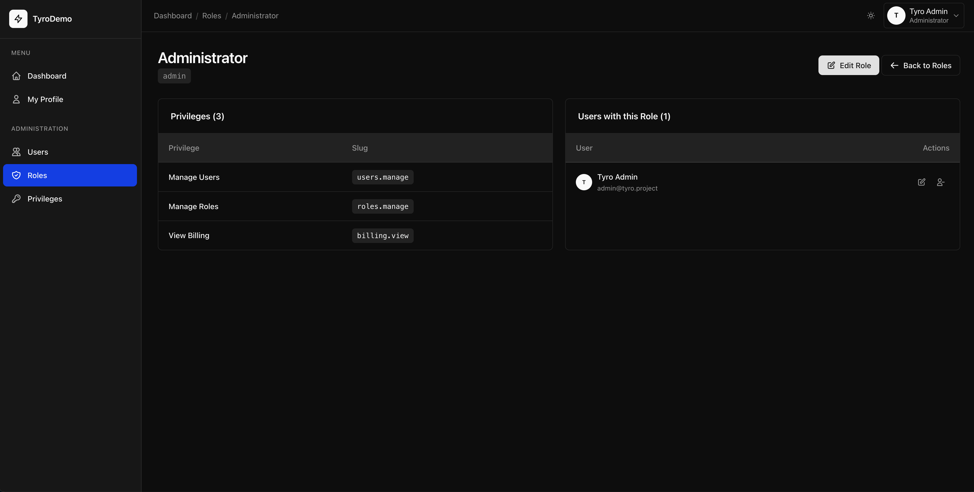 Tyro Dashboard implements role-based access control: