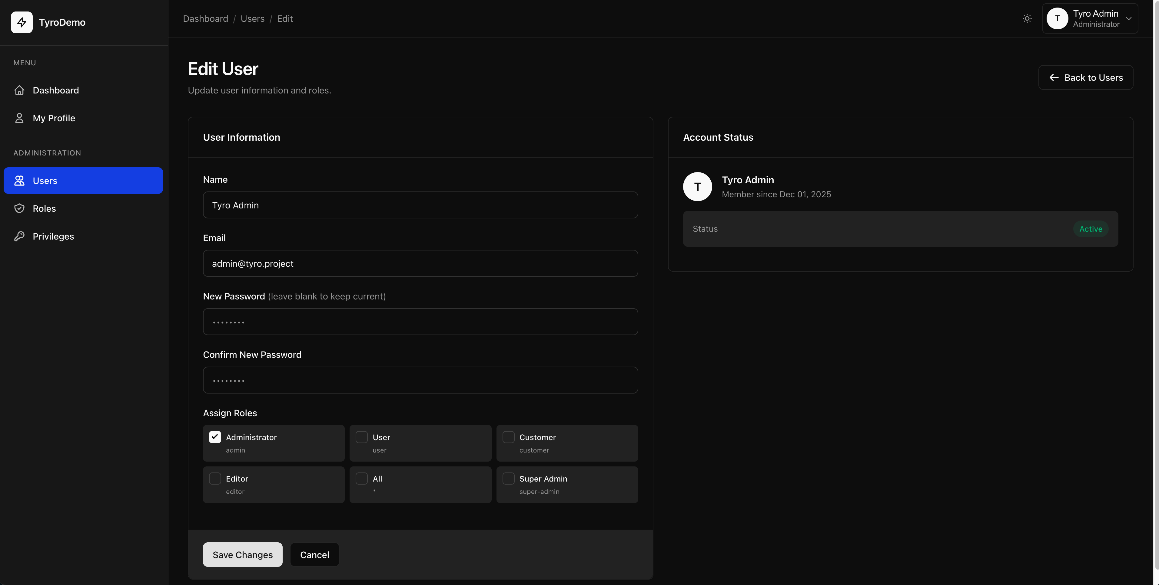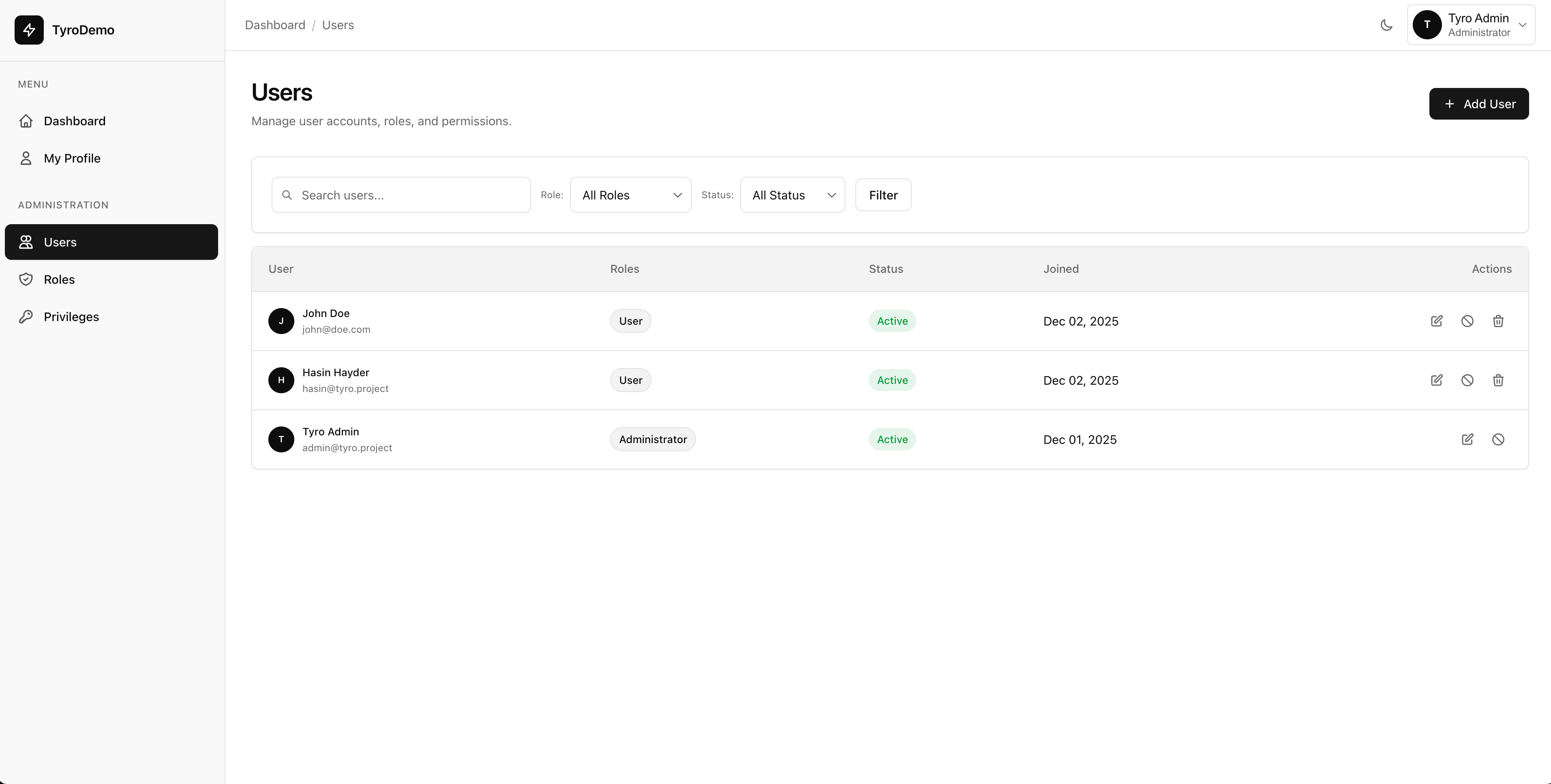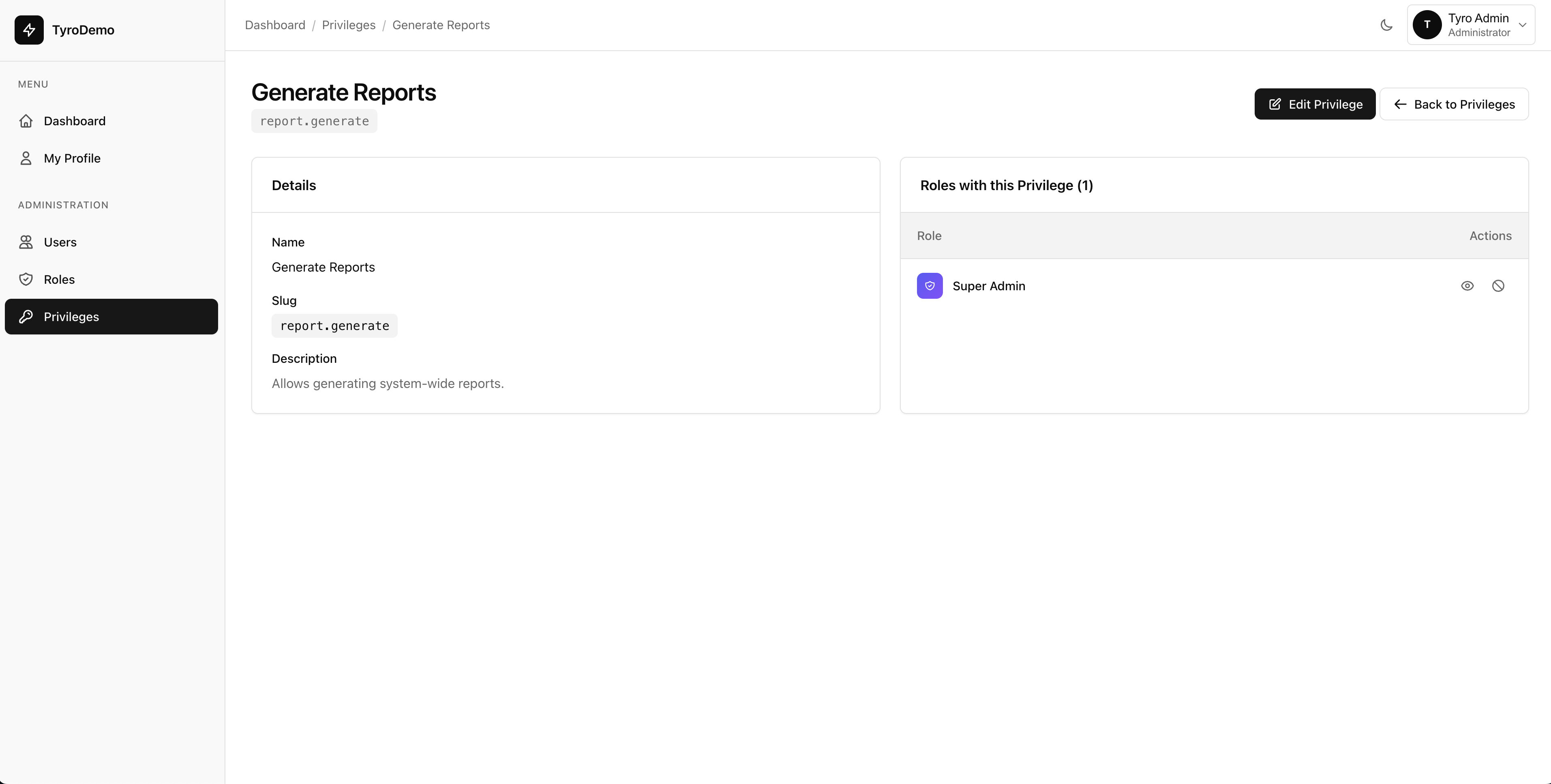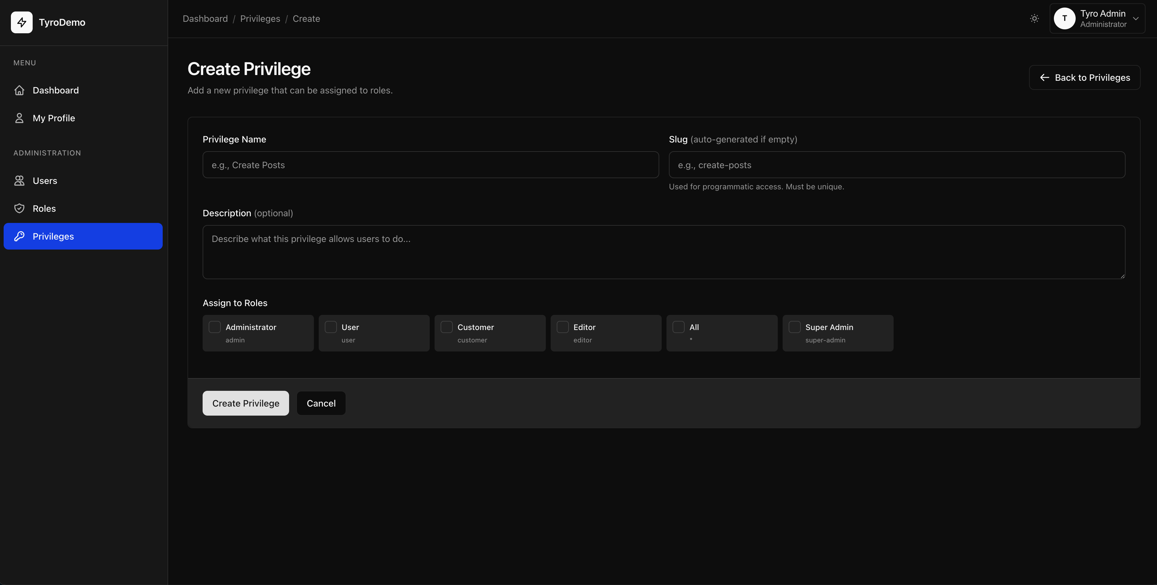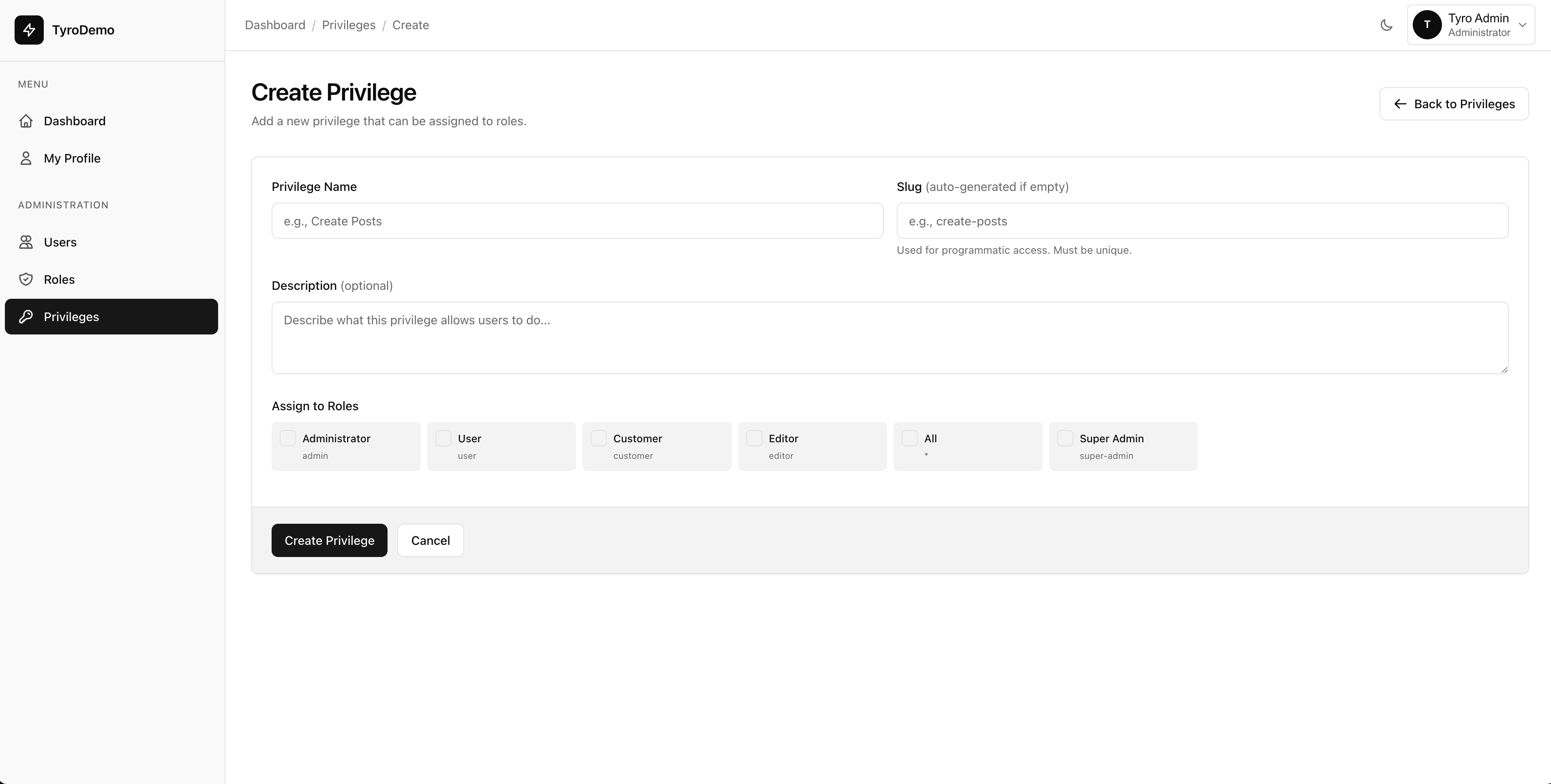 Everything you need to build a beautiful admin dashboard for managing Tyro roles, privileges, users, and package settings in Laravel 12.
